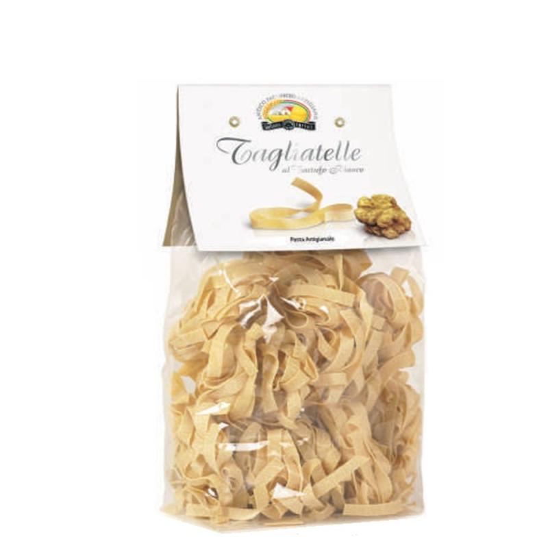 Vere Tagliatelle al Tartufo bianco. Durante la lavorazione della pasta, uno degli ingredienti è il Tartufo. Quello vero. Le pezzature piccolissime, non commerciabili, vengono frullate per donare al composto della pasta aromi, profumi e sapori.